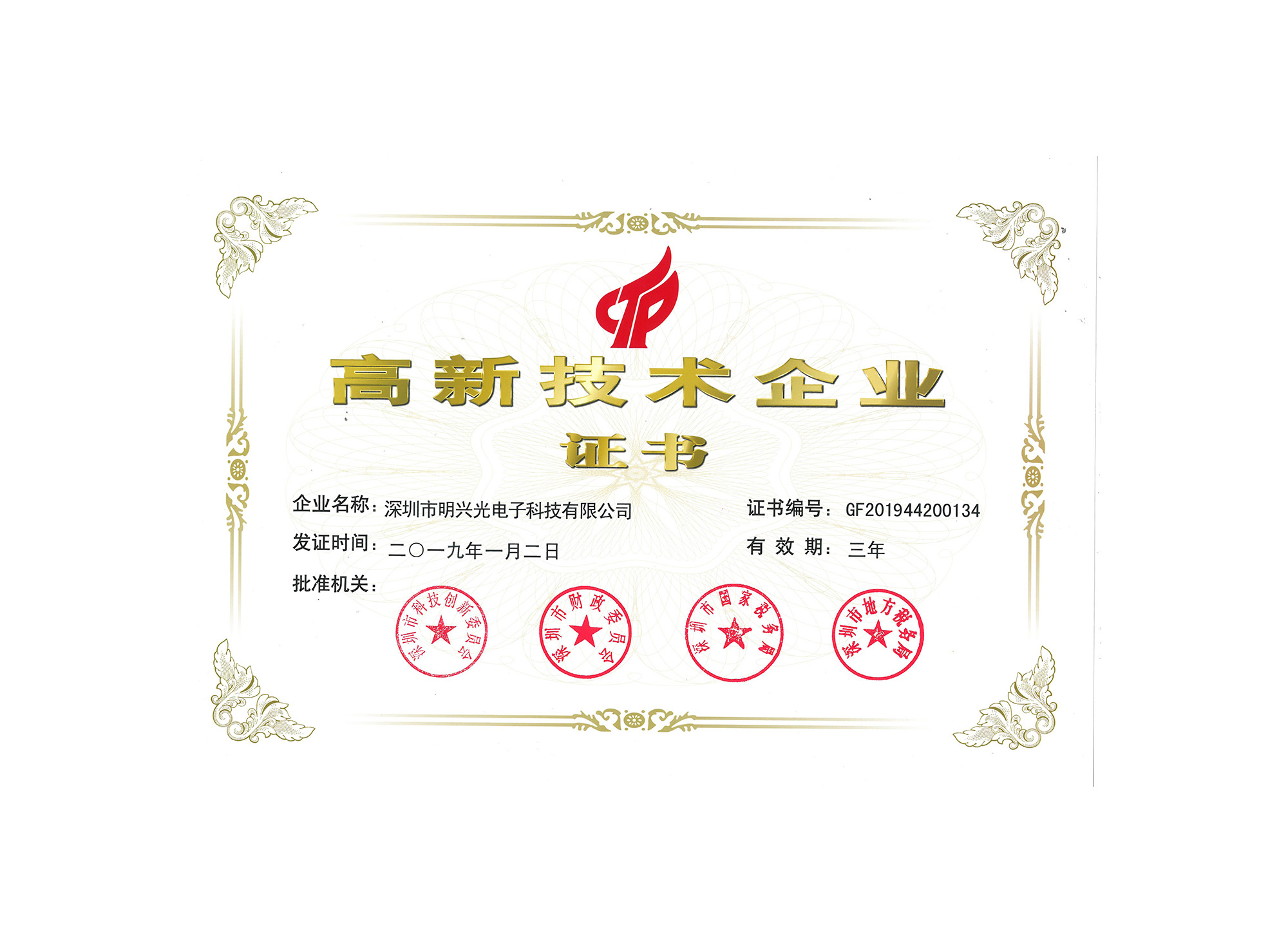 高新技术企业证书