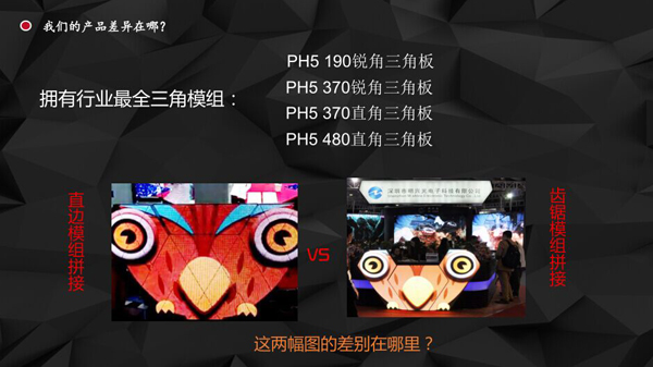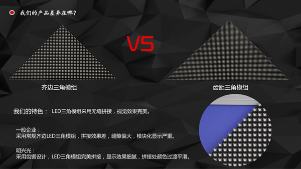 采用常规齐边LED三角模组,拼接效果差,缝隙偏大,模块化显示严重。